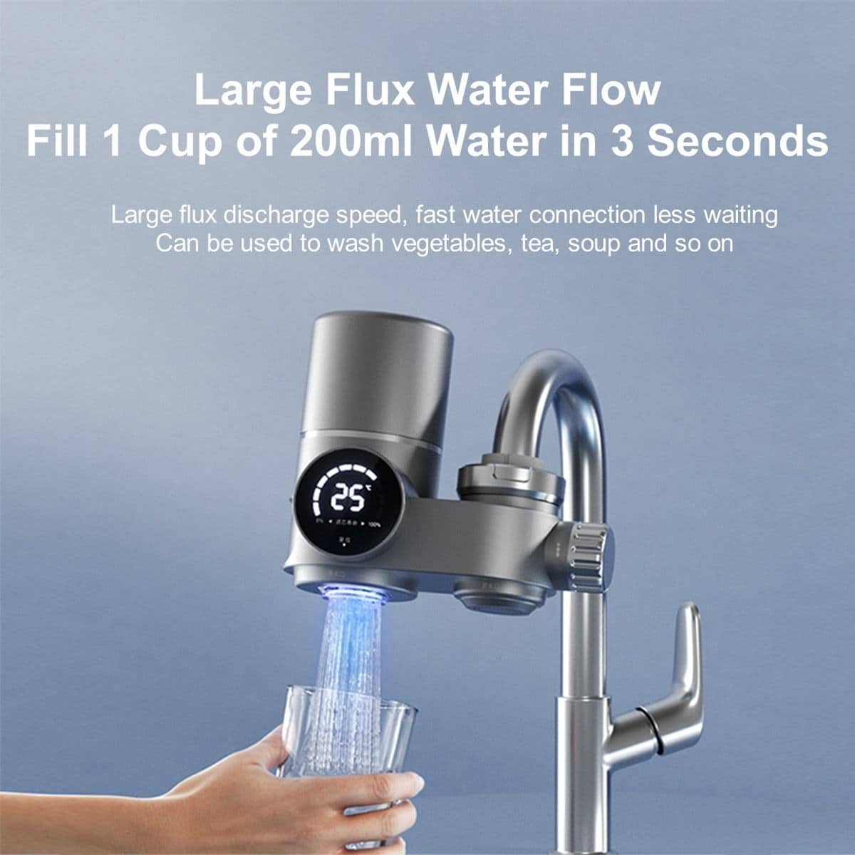 HydrTapi operates safely with water temperatures between 41-122°F (5-50°C). The digital display shows current water temperature to prevent accidental scalding, making it perfect for everyday kitchen and bathroom use with warm or cold water.