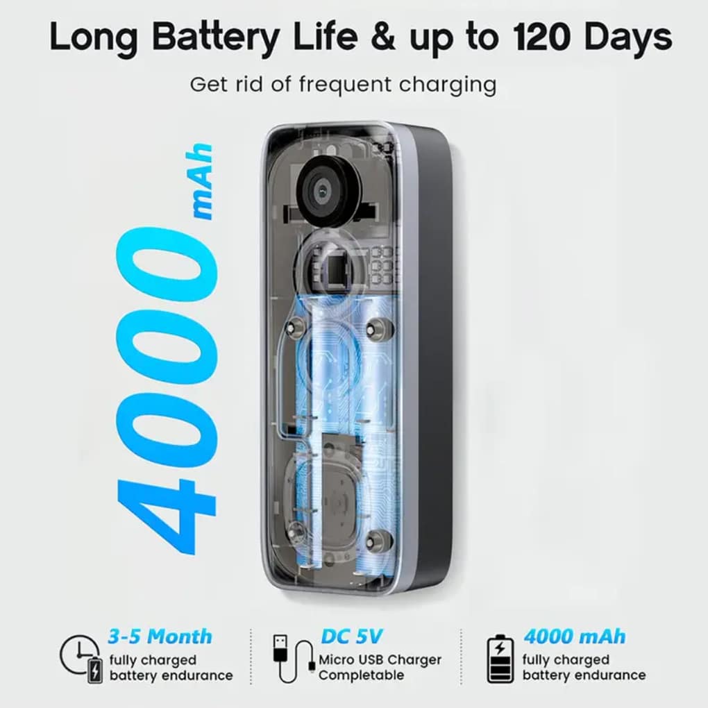 Battery life varies based on usage, but typically lasts 2-4 months. Smart PIR wake-up conserves power, and recharging via USB or Type-C takes just a few hours.