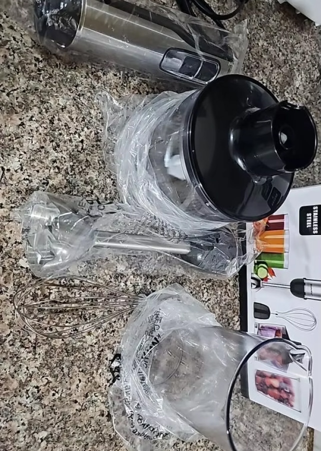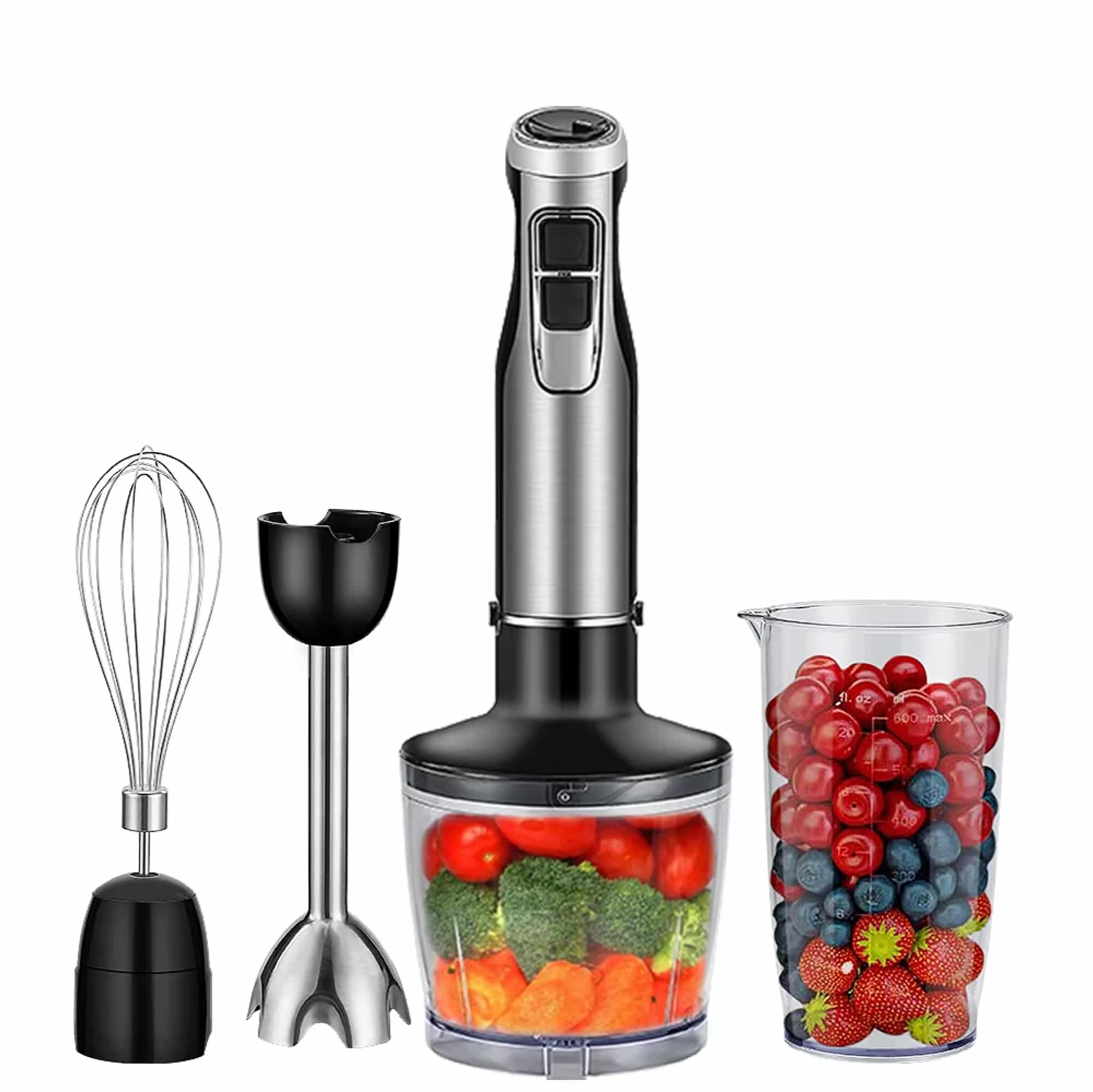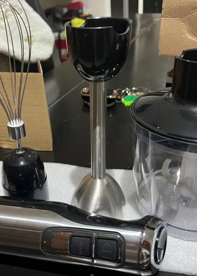 The MixiPert comes with four specialized attachments including a blending shaft, whisk attachment, chopping bowl, and mixing beaker, providing comprehensive functionality for all your blending, whipping, and chopping needs in one package.
