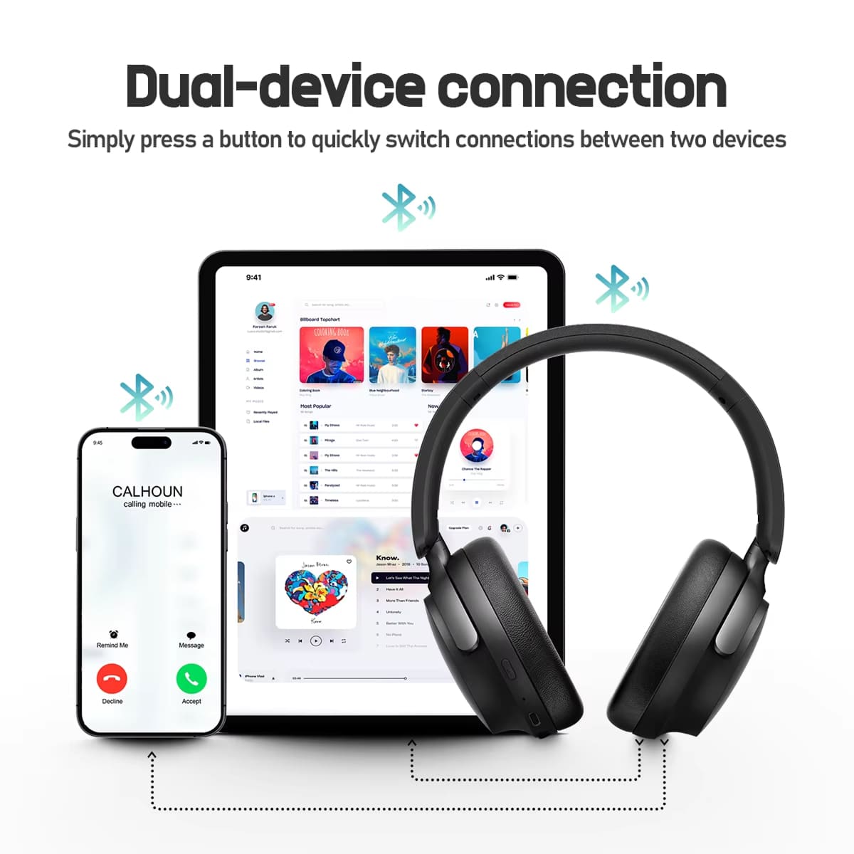 Yes, Bluetooth 5.4 technology enables dual-device connectivity, allowing you to connect to two devices simultaneously and switch seamlessly between them for calls, music, or video content.