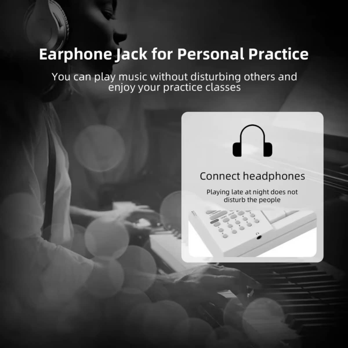 While primarily designed for headphone use, the keyboard includes standard audio output that's compatible with most external speakers and amplifiers for performance or group learning situations.