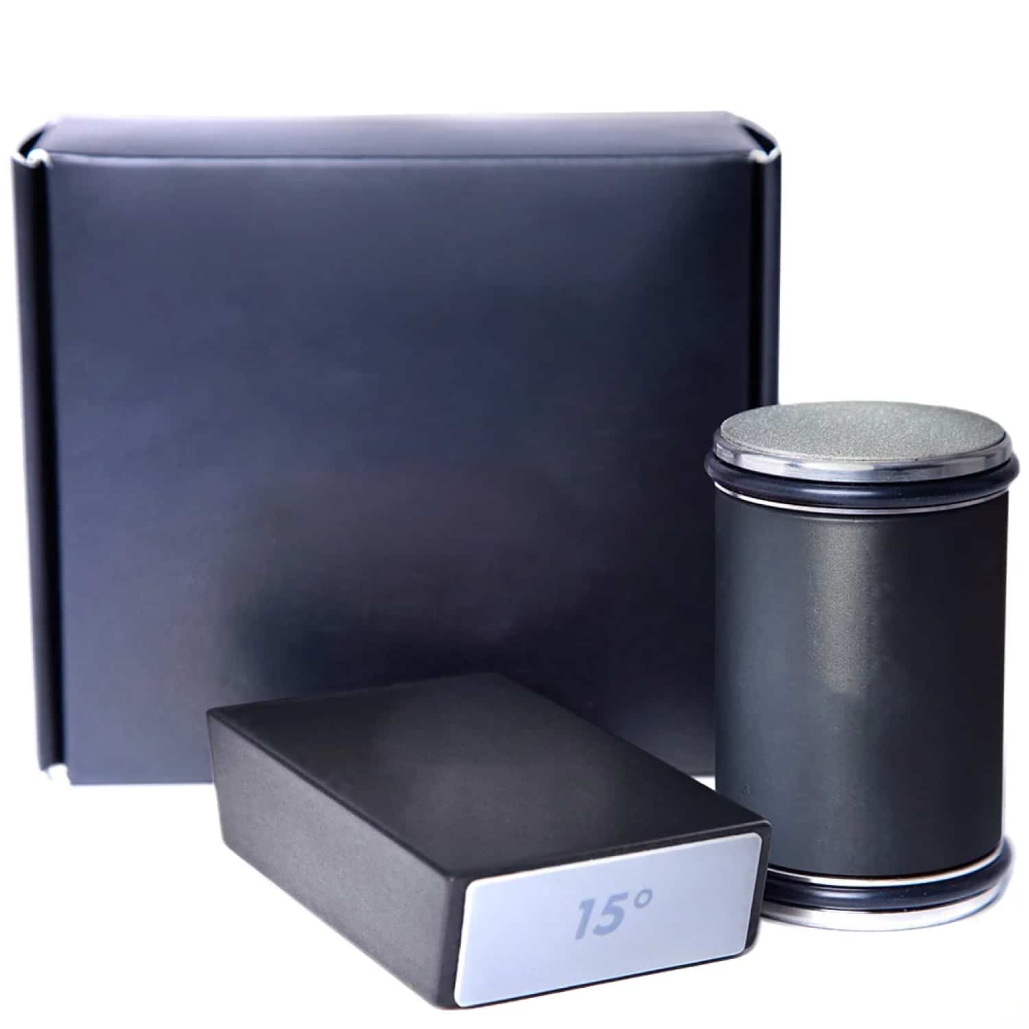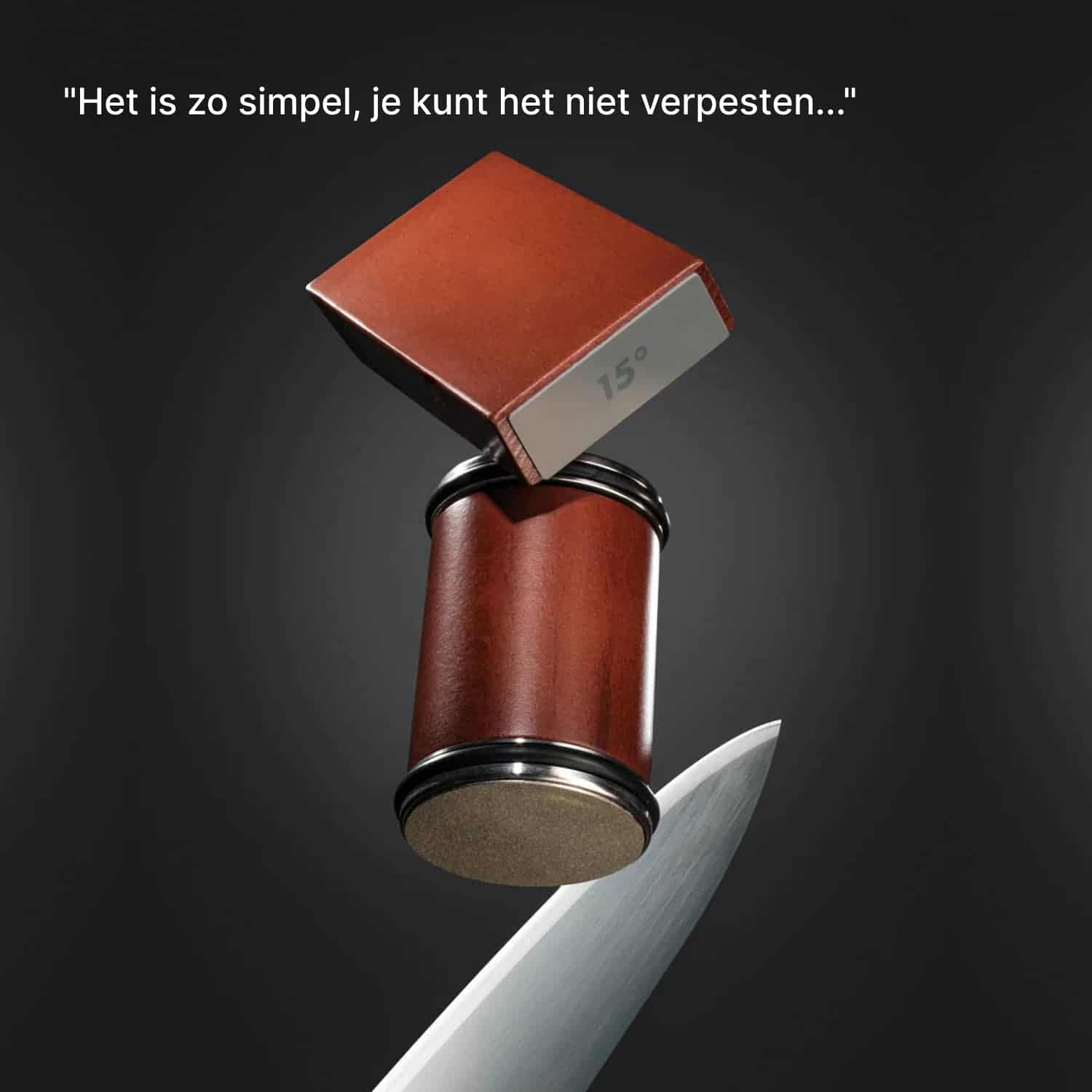 Ja, kies tussen 15° voor Aziatische messen en 20° voor westerse messen via de dubbele magnetische geleiding.
